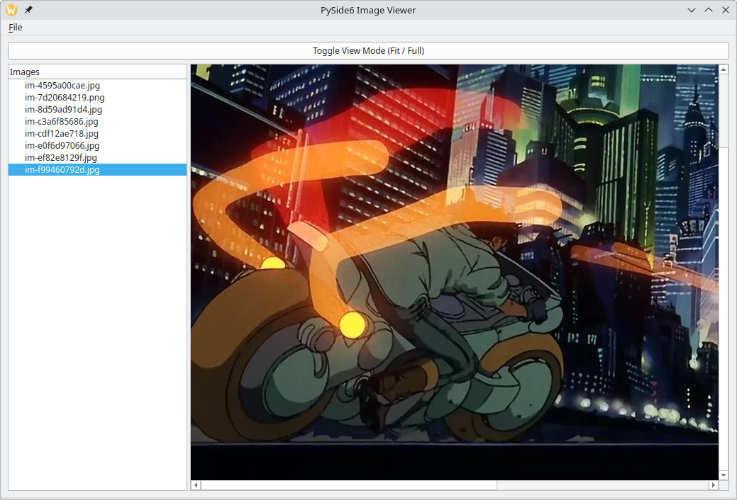 I'd like to make a PySide6 image viewer. The image viewer should have an Open Folder menu action that recursively loads all images in the given directory or directories (along with Quit/Ctrl+Q). The UI should be a split-pane, where the left side is a Tree of the directories and image files, and the much-larger right pane should show the image. The image can be toggled between two viewing modes - fit to the viewport, or full resolution (which should use scrollbars and be pannable by clicking and dragging).