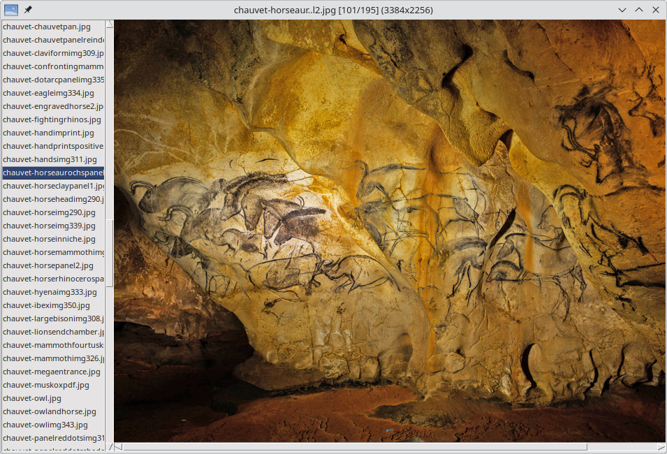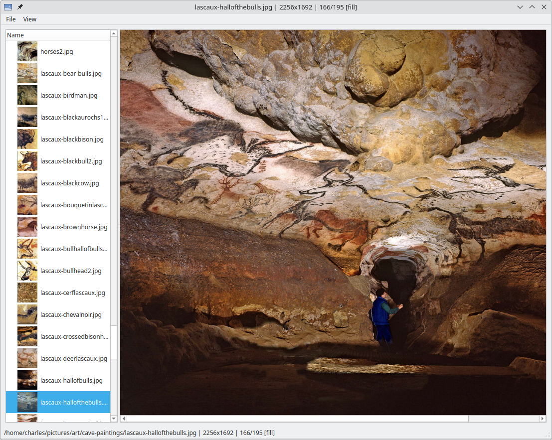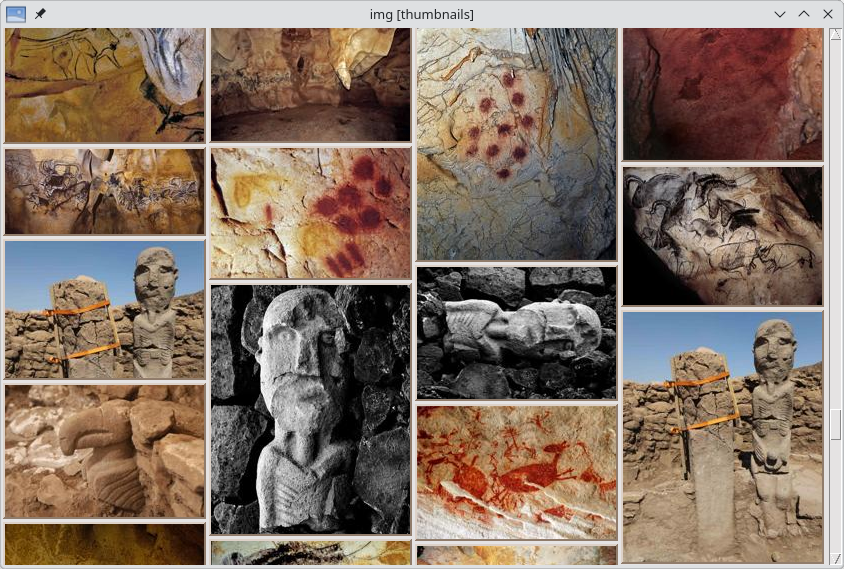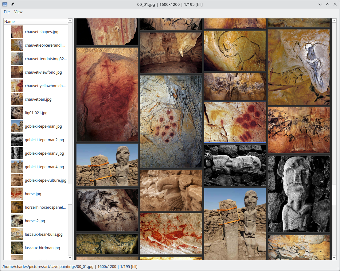 I found it cumbersome to scroll through the list of files, so I added a thumbnail gallery view later. This took a while to get right and it hardly used any of the existing code. I remember it took longer-than-expected trying to get the beveled outline around the focused image to display and update correctly. Eventually it worked, though, and it worked very well! It supports vim-style navigation and has quite a bit of functionality exposed via keybinds and context menus: